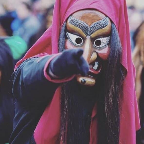 - Die Maske der Bühlersteiner Hexe ist mit einem bordeauxroten Tuch und mit grünen Flicken umsäumt.